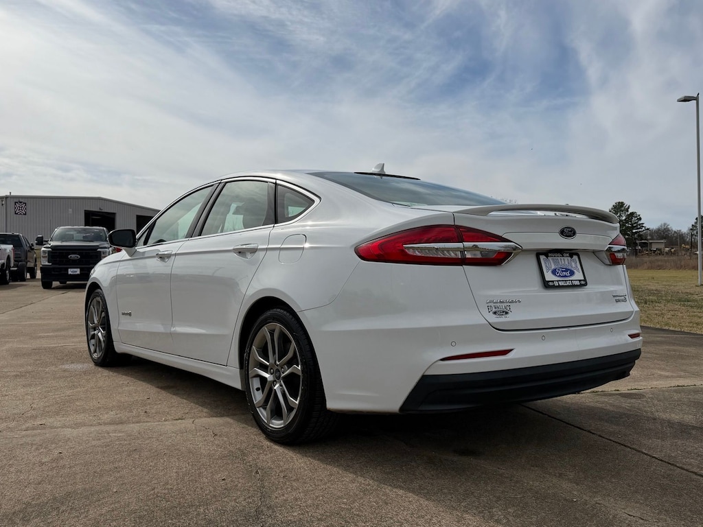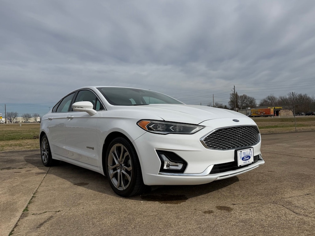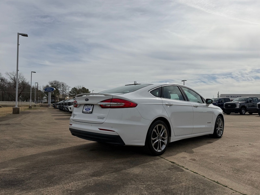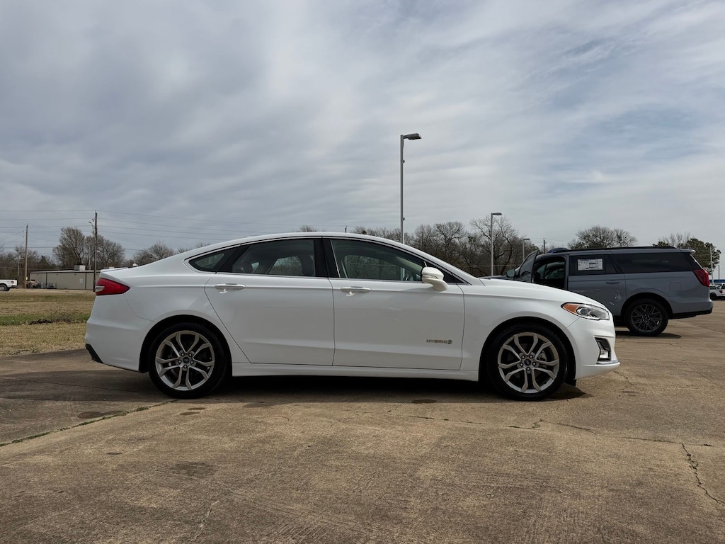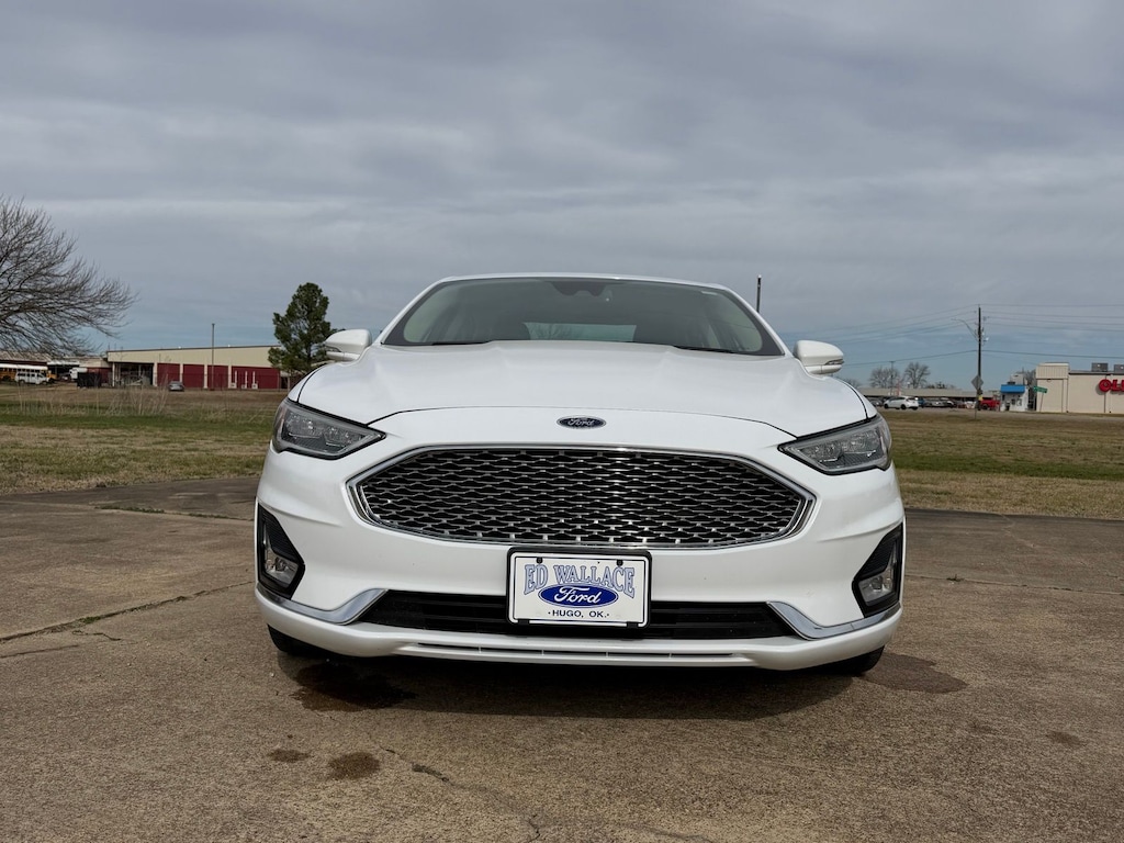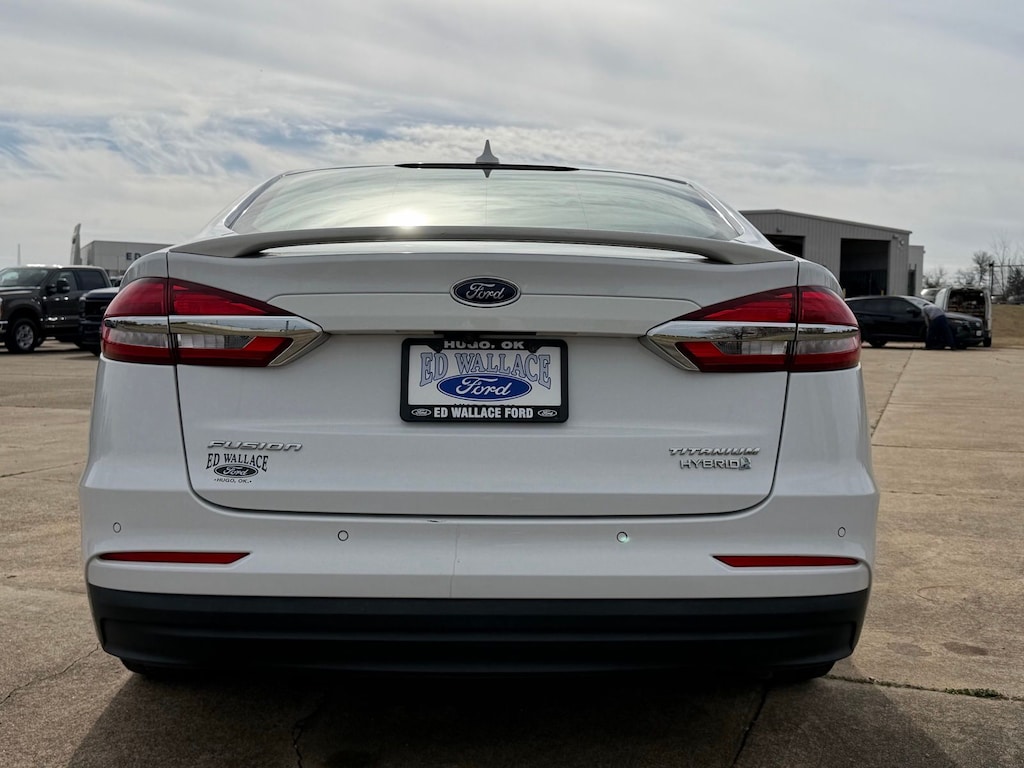 Let the team at Ed Wallace Ford introduce you to an entirely new kind of car-buying experience. This 2019 Ford Fusion Hybrid Titanium in Oxford White comes with the following features: I4 Hybrid eCVT FWD New Tires I4 Hybrid I4 Hybrid, 12 Speakers, 4-Wheel Disc Brakes, ABS brakes, Active Cruise Control, Air Conditioning, Alloy wheels, AM/FM radio: SiriusXM, Auto High-beam Headlights, Auto-dimming door mirrors, Auto-dimming Rear-View mirror, Automatic temperature control, Brake assist, Bumpers: body-color, CD player, Compass, Delay-off headlights, Driver door bin, Driver vanity mirror, Dual front impact airbags, Dual front side impact airbags, Electronic Stability Control, Emergency communication system: SYNC 3 911 Assist, Exterior Parking Camera Rear, Four wheel independent suspension, Front anti-roll bar, Front Bucket Seats, Front Center Armrest, Front dual zone A/C, Front fog lights, Front License Plate Bracket, Front reading lights, Fully automatic headlights, Garage door transmitter, Heated door mirrors, Heated front seats, Heated steering wheel, Illuminated entry, Knee airbag, Lane Departure Warning System, Leather Heated/Cooled Sport Bucket Seats, Low tire pressure warning, Memory seat, Navigation System, Occupant sensing airbag, Outside temperature display, Overhead airbag, Overhead console, Panic alarm, Passenger door bin, Passenger vanity mirror, Power door mirrors, Power driver seat, Power moonroof, Power passenger seat, Power steering, Power windows, Radio data system, Radio: AM/FM Stereo w/MP3/Single-CD Player, Rain sensing wipers, Rear anti-roll bar, Rear Parking Sensors, Rear reading lights, Rear seat center armrest, Rear window defroster, Remote keyless entry, Security system, Speed control, Speed-sensing steering, Speed-Sensitive Wipers, Split folding rear seat, Spoiler, Steering wheel mounted audio controls, SYNC 3 Communications & Entertainment System, Tachometer, Telescoping steering wheel, Tilt steering wheel, Traction control, Trip computer, Turn signal indicator mirrors, Variably intermittent wipers, Ventilated front seats, and Wheels: 18" Premium-Painted Aluminum. 43/41 City/Highway MPG